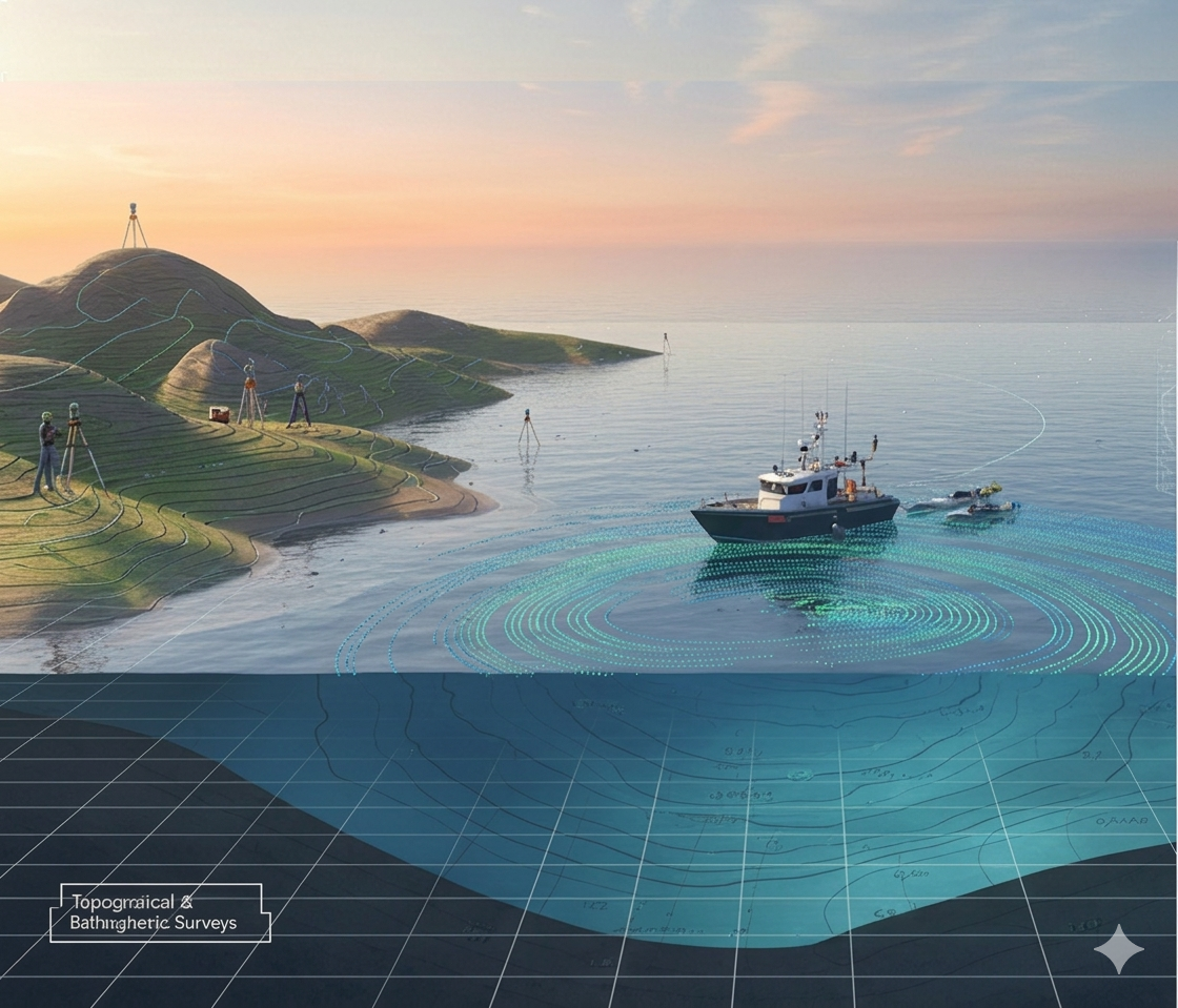 We provide precise topographical and bathymetric surveys to map land and underwater terrains using advanced GPS, Total Station, and echo-sounding technologies. These surveys deliver accurate elevation and depth data essential for planning, design, and engineering of infrastructure and marine projects.